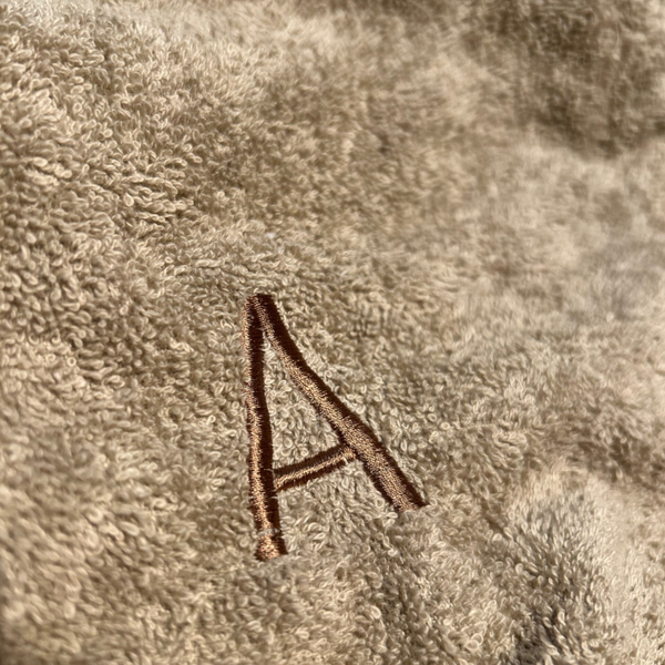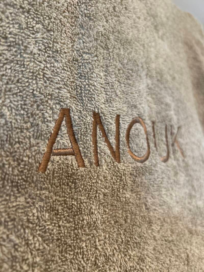 Badjas: Kleur garen Donker Beige | Lettertype Noor | Maten: zie maattabel
