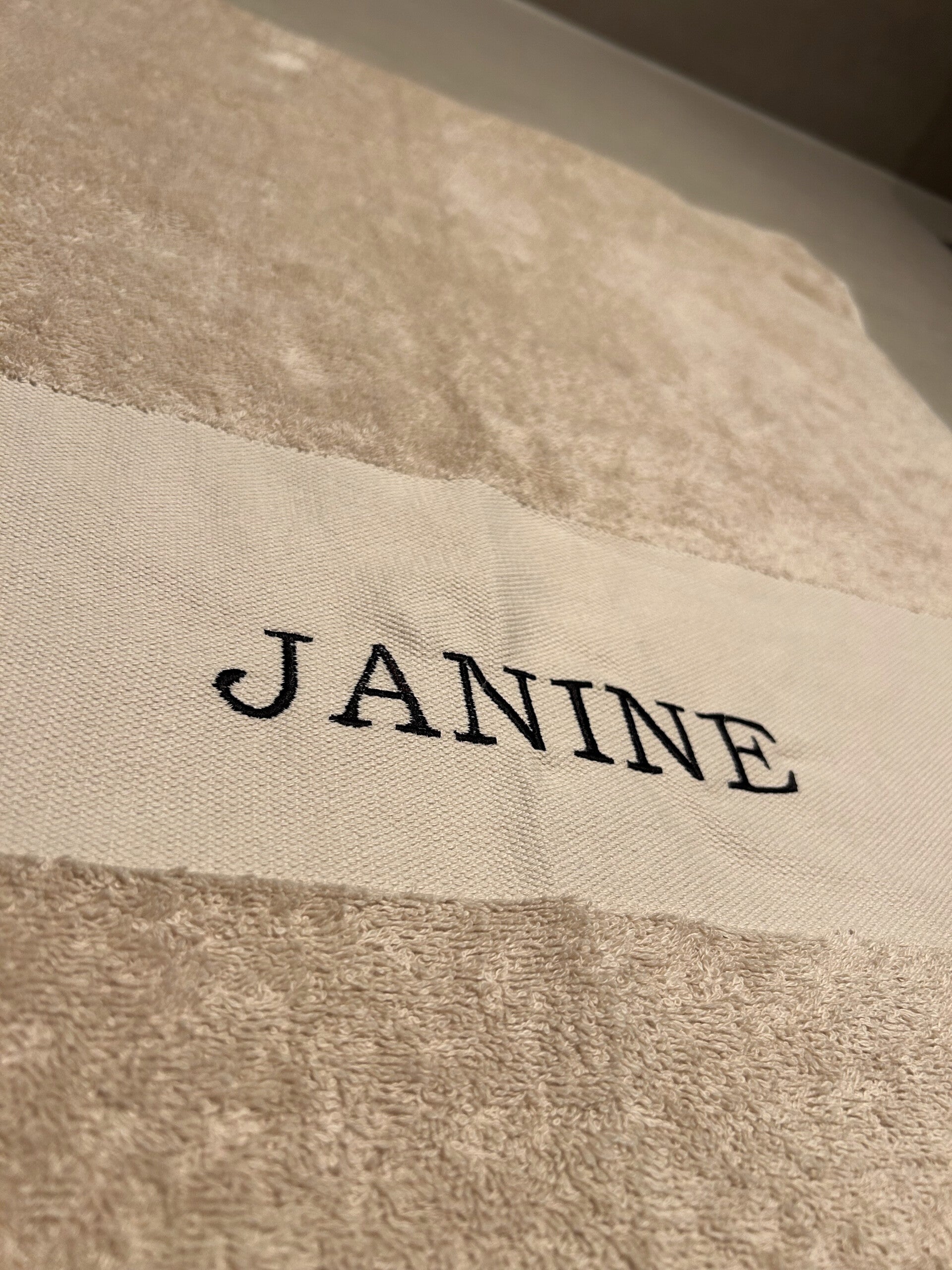 Douchelaken: Afmeting 70 x 140 cm | Kleur garen: Zwart | Lettertype Mila
