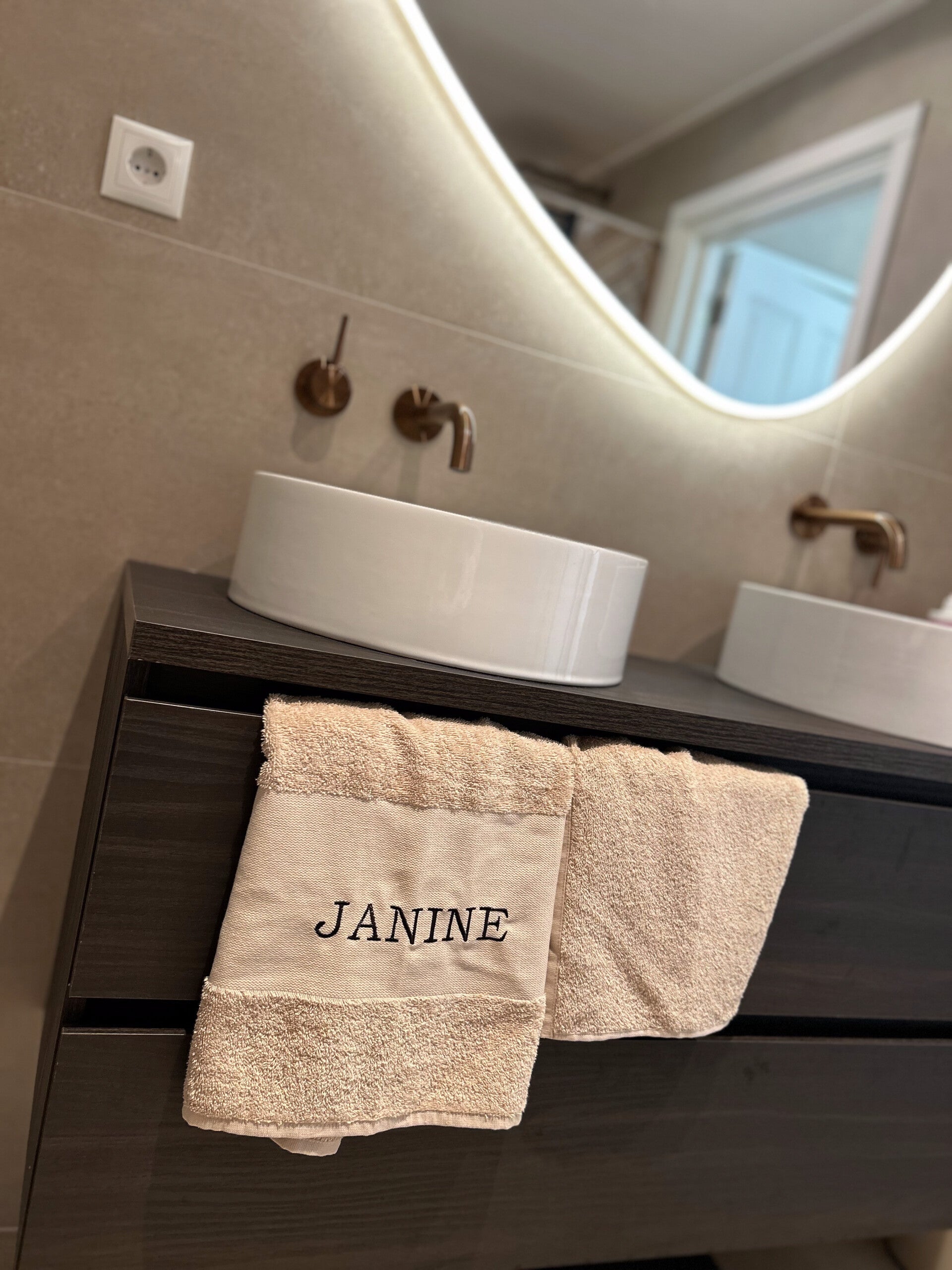 Het douchelaken is van dezelfde zachte kwaliteit katoen, met een afmeting van 70 x 140 cm. Het neemt vocht goed op en voelt comfortabel aan. Voeg een naam op de voorzijde toe voor een extra persoonlijk tintje.